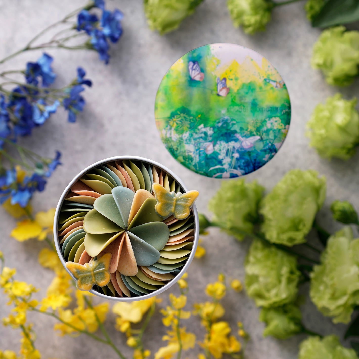 フランス・カオカ社のオーガニックホワイトチョコレートに、ピスタチオや抹茶、レモン、マンゴー、木苺などの果実や茶の香りを重ね、蝶と花々が舞うペタルを花束のように仕立てました。