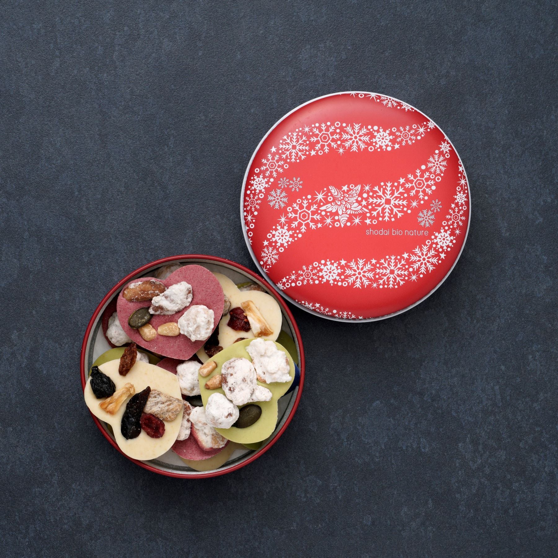 愛らしいハート型のチョコレートに、ナッツやドライフルーツを贅沢に散りばめた「クリスマスマンディアン」。