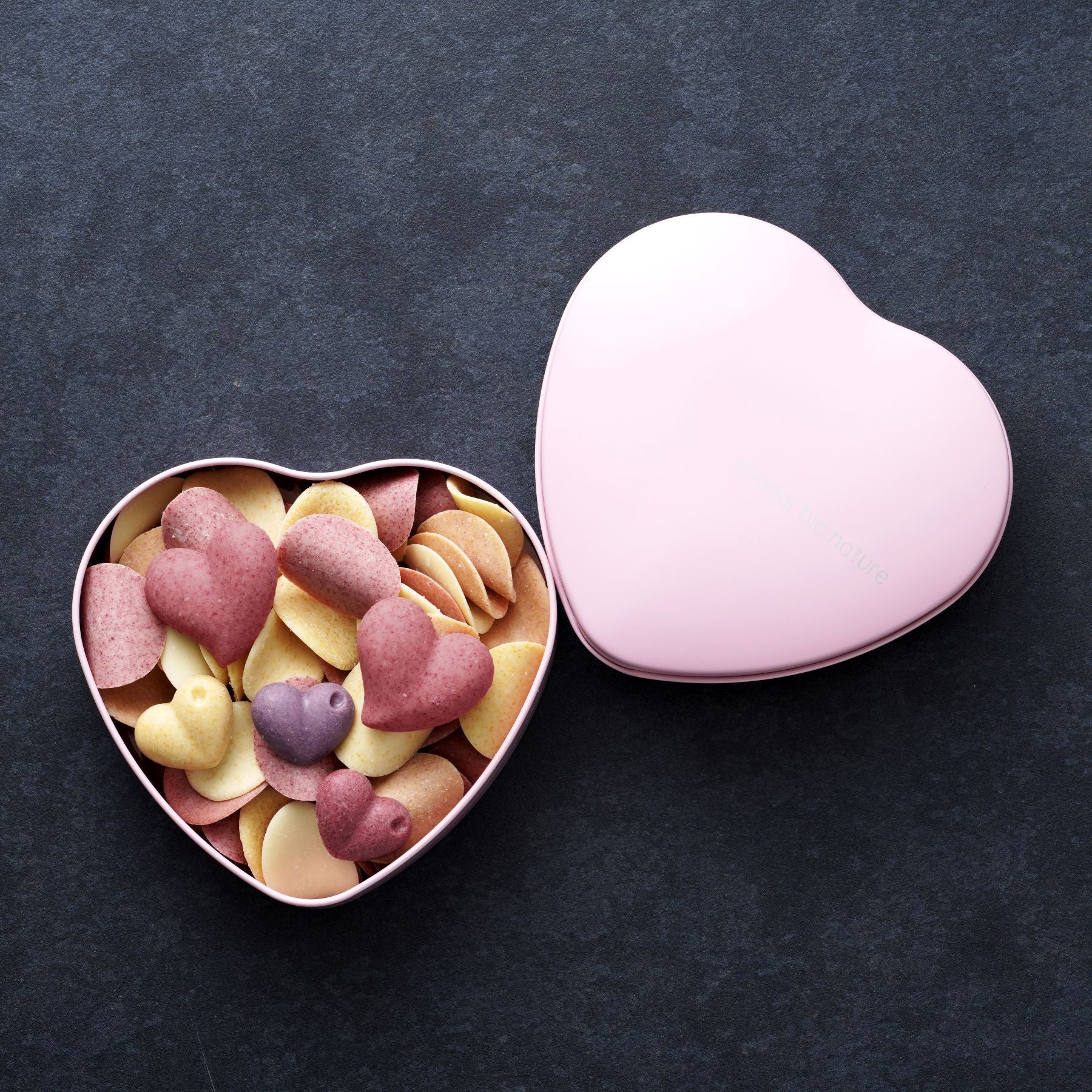 シンプルなピンクのハート缶に入った淡い色のペタルは、春風に乗って軽やかに舞い踊る花びらを思わせます。ふんわりと広がるロゼ色のドレスのように、繊細で優美なチョコレートたちが贈る人の心をそっと彩ります。