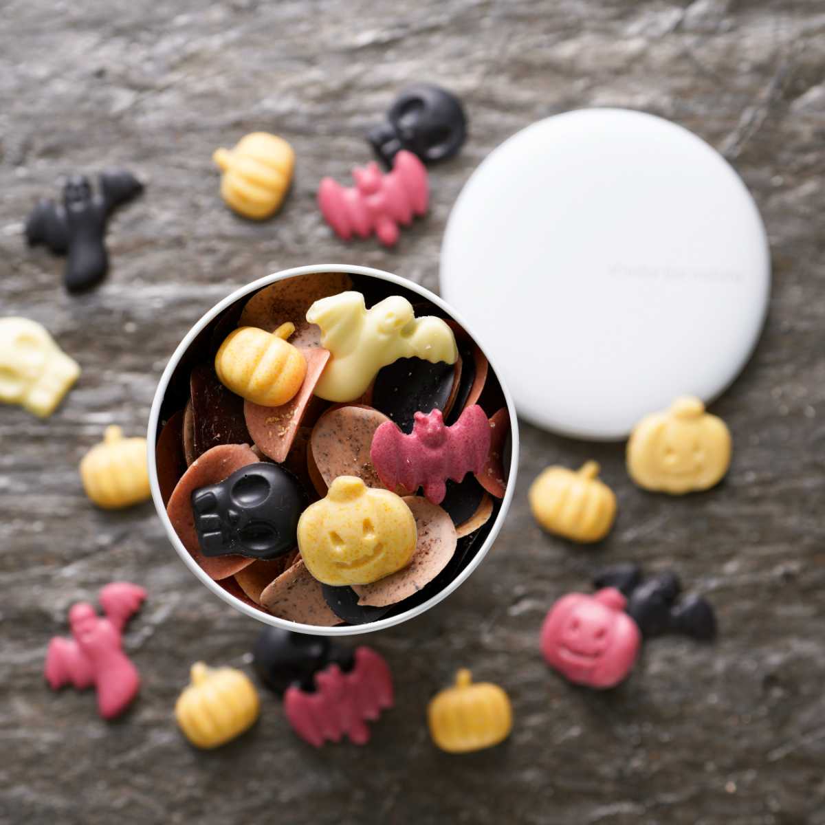 秋の祭りの賑わいを思わせる、遊び心あふれるハロウィン限定のペタルチョコレート。缶を開けた瞬間、パンプキンやゴーストをかたどった小さなオーナメントチョコレートが、愛らしくお出迎えします。