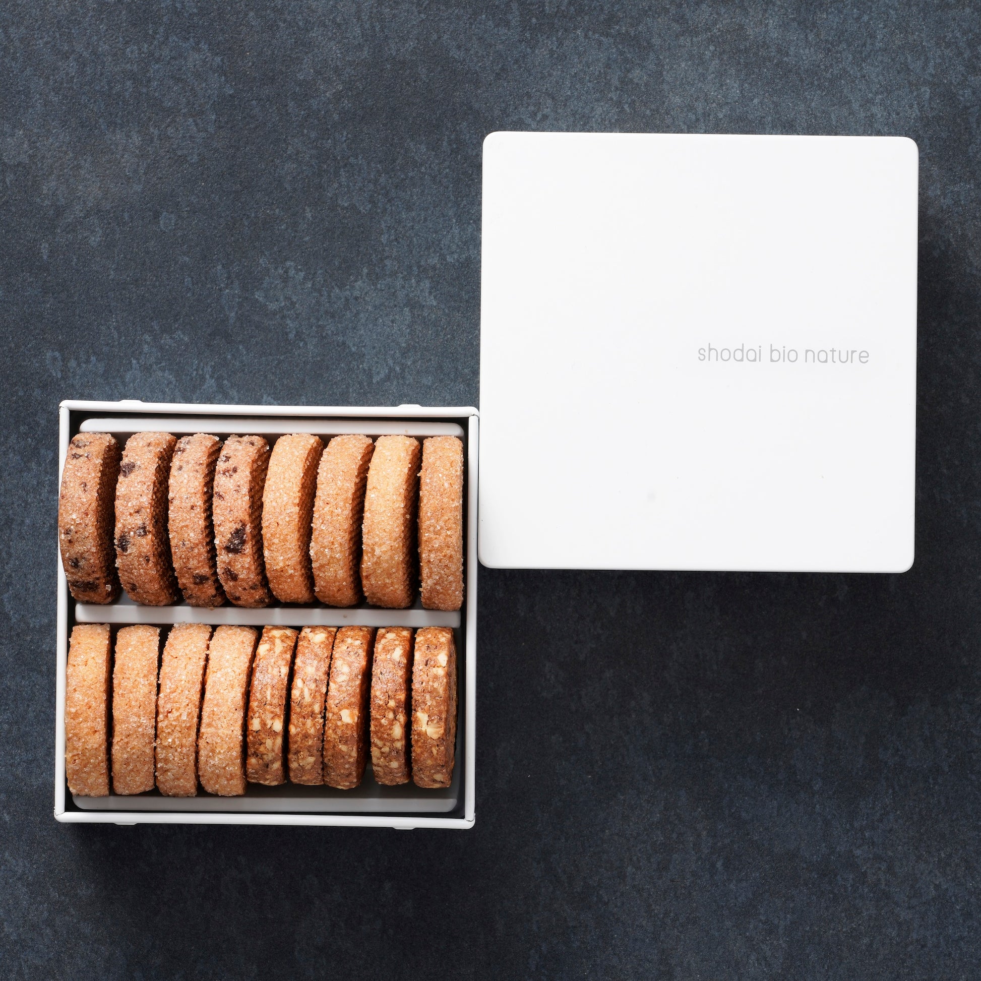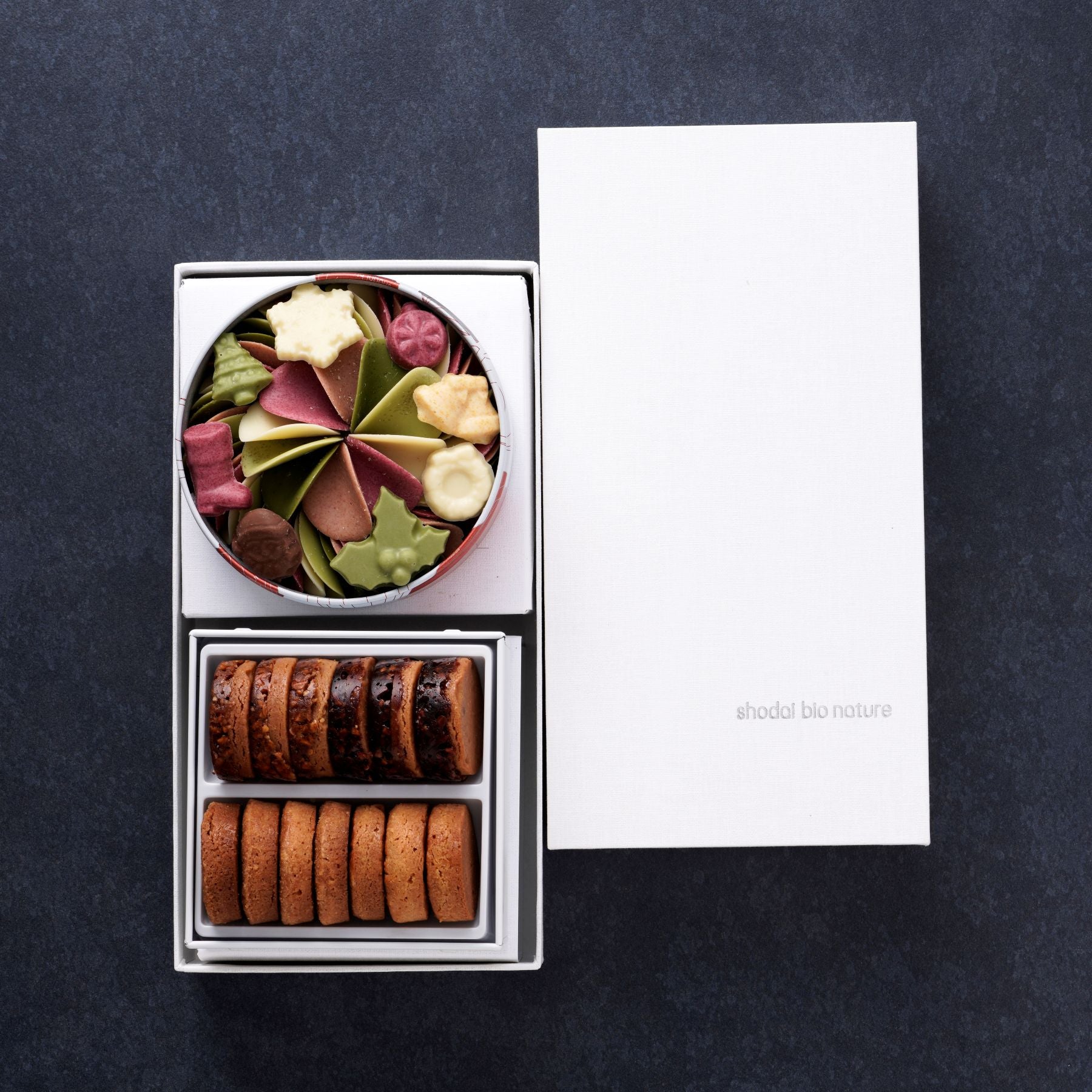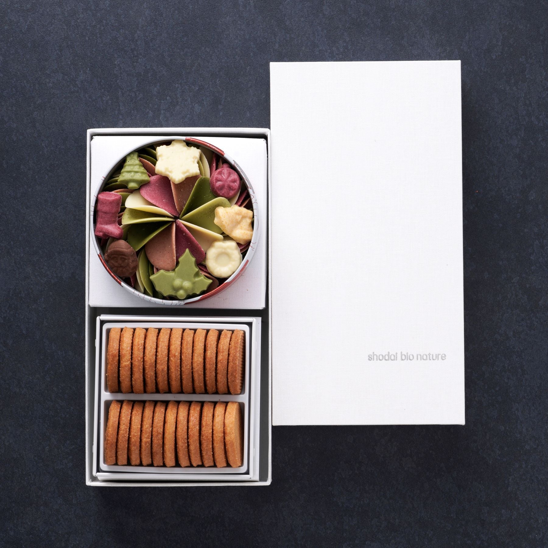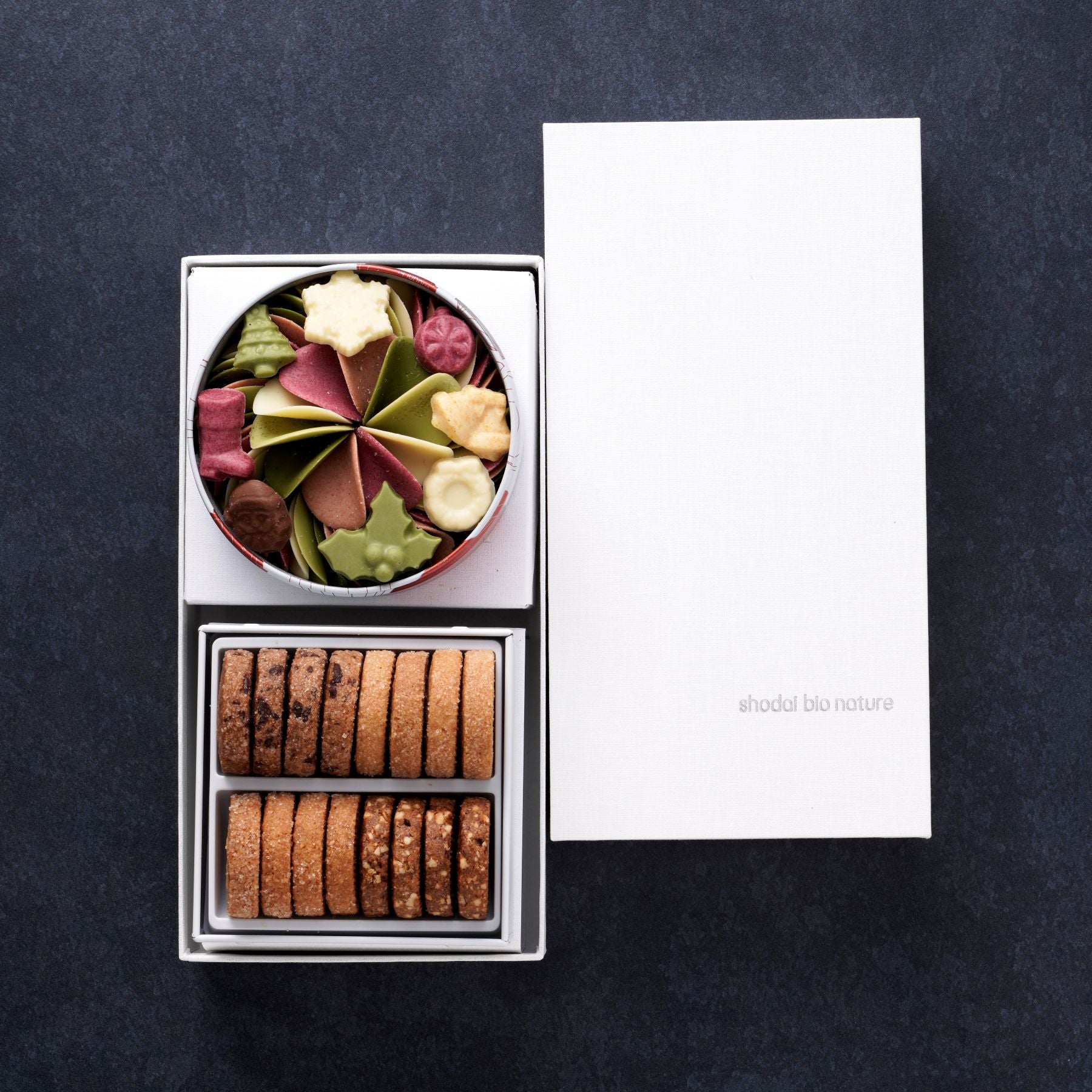 素材の魅力を引き出した、花びらのように繊細なチョコレートと、3種類から選べるクッキー缶。 自然の恵みを閉じ込めた2つの味わいを、白いロゴ入りギフト箱に丁寧に詰め合わせました。