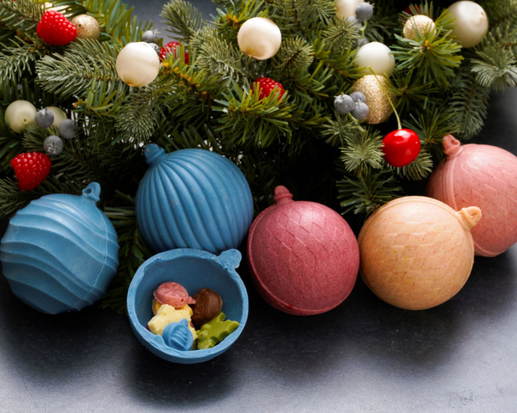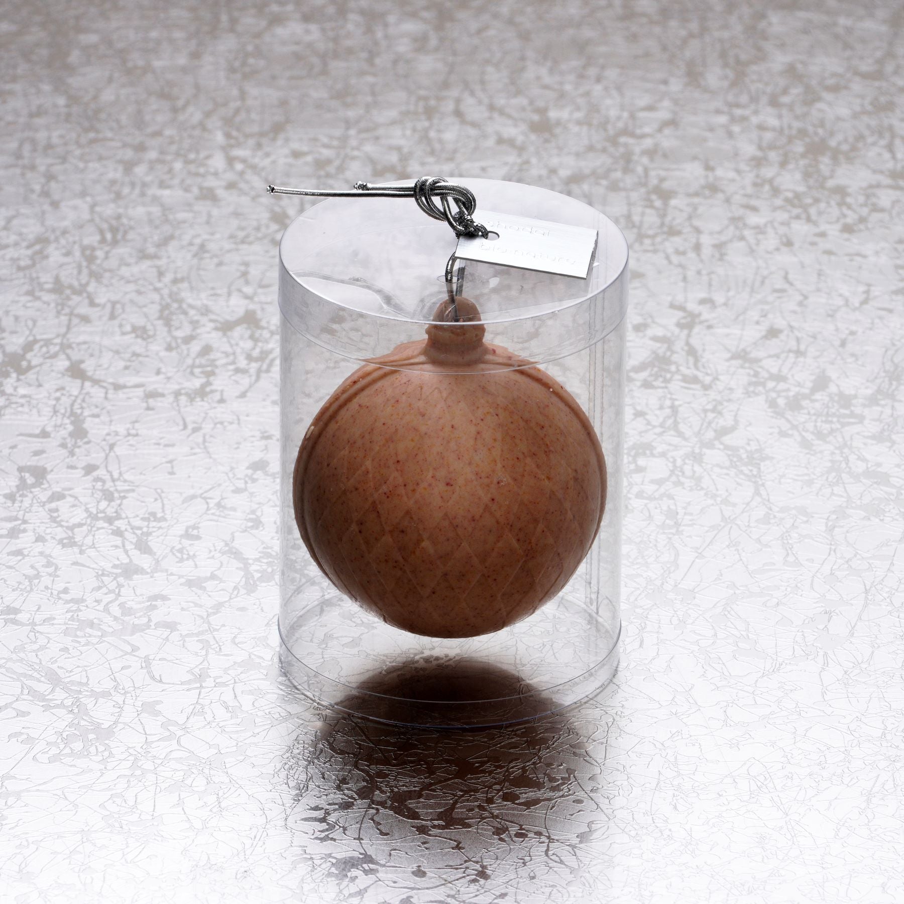 箱の中には、透明なパッケージに詰められたクリスマスオーナメント型のチョコレートが。見た目にも華やかで、口に入れた瞬間広がる濃厚な味わいは、この季節だけの特別なひとときを演出します。
